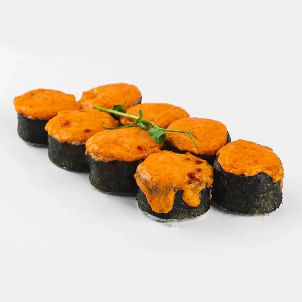 Рис, нори, сливочный сыр, томат, снежный краб (имитация), острая сырная шапочка. * Обратите внимание: при доставке запеченные и темпурные роллы могут быть не такими горячими, как при подаче в ресторане. Это не влияет на вкус, качество и свежесть ингредиентов внутри.