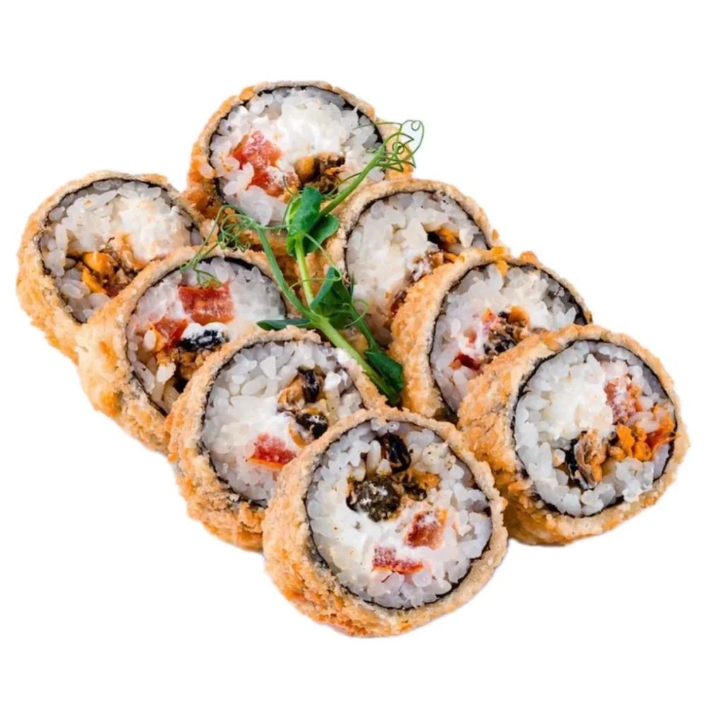 Рис, нори, темпурная смесь, сливочный сыр, мидии, помидор, соус Унаги.