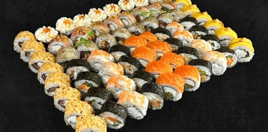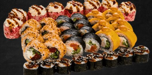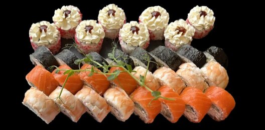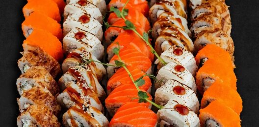 Ролл «Филадельфия Мандарин» 0,5 : рис, нори, лосось, сливочный сыр, мандарин, соус манго.