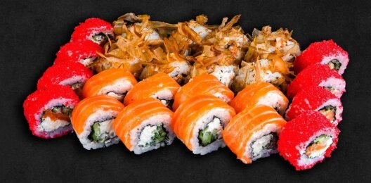 Ролл «Филадельфия Deluxe»: рис, нори, сливочный сыр, лосось, лососевая икра.