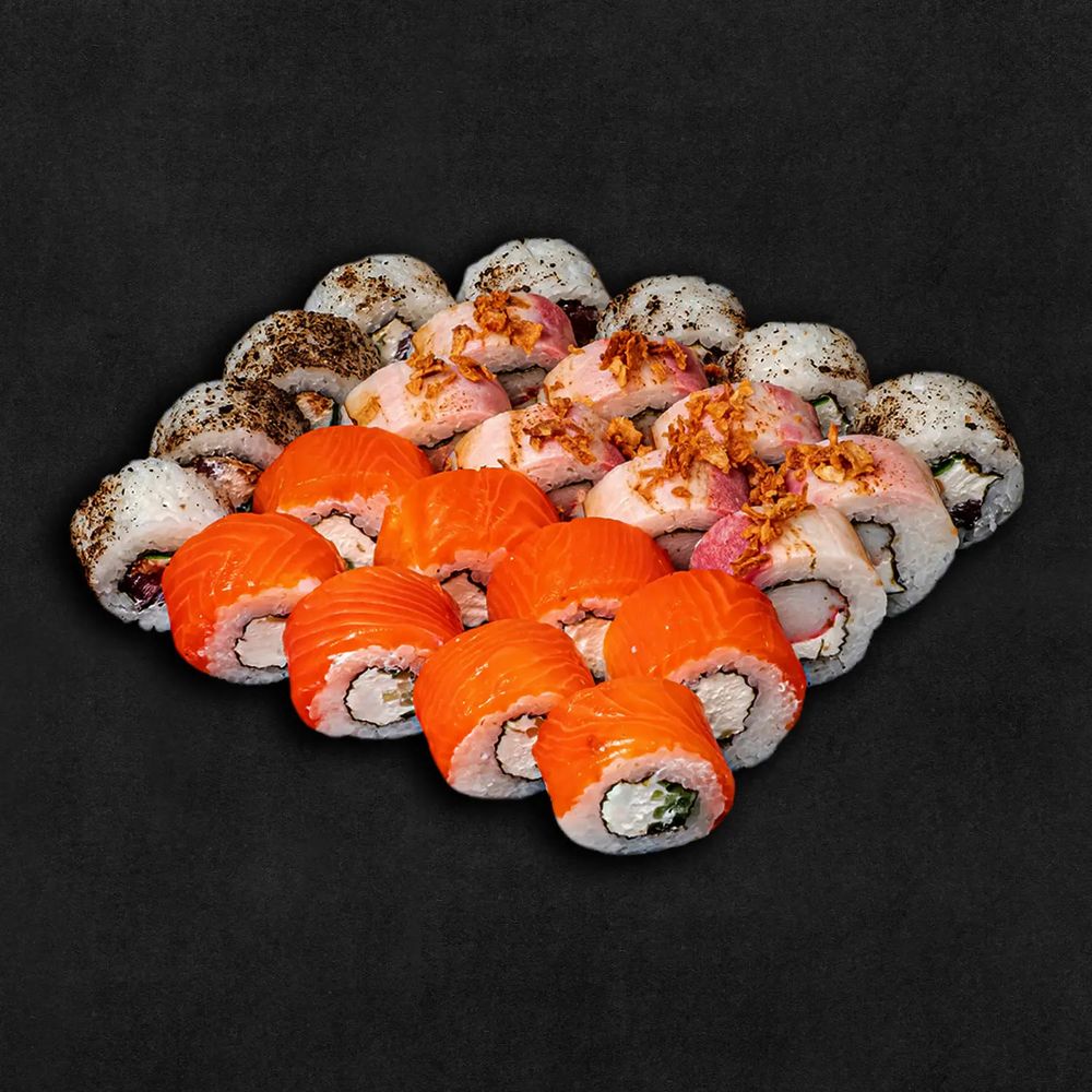 🔥Ролл «Гурмэ» (острый) : рис, нори, тунец, сливочный сыр, лук зеленый, лук кранч, черный перец.