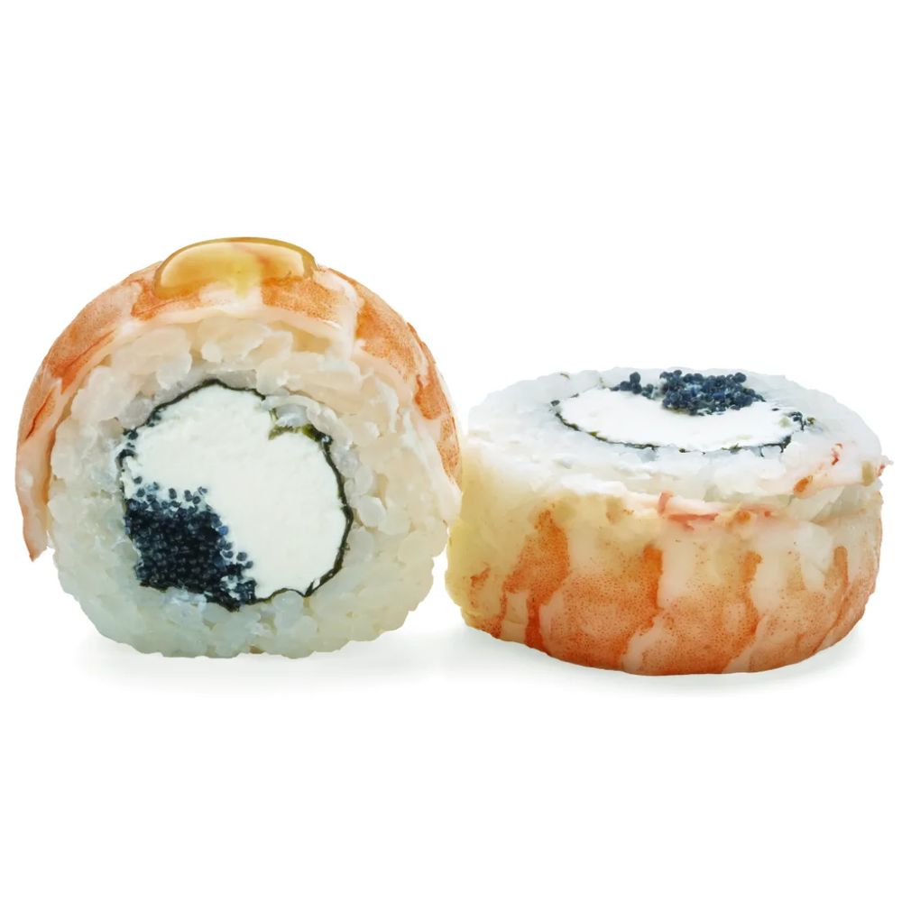 Рис, нори, креветка, сливочный сыр, икра Тобико, соус Юдза.