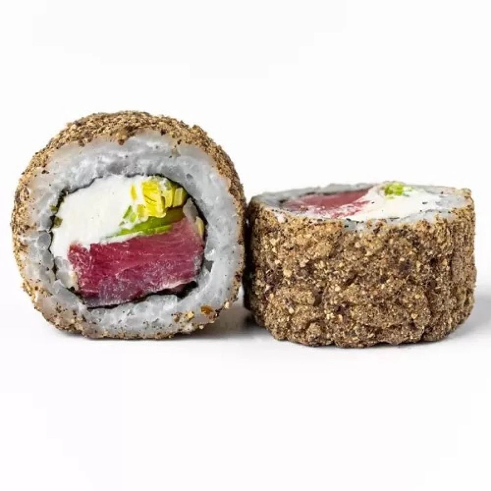 Рис, нори, тунец, сливочный сыр, лук зеленый, лук кранч, черный перец. Острый