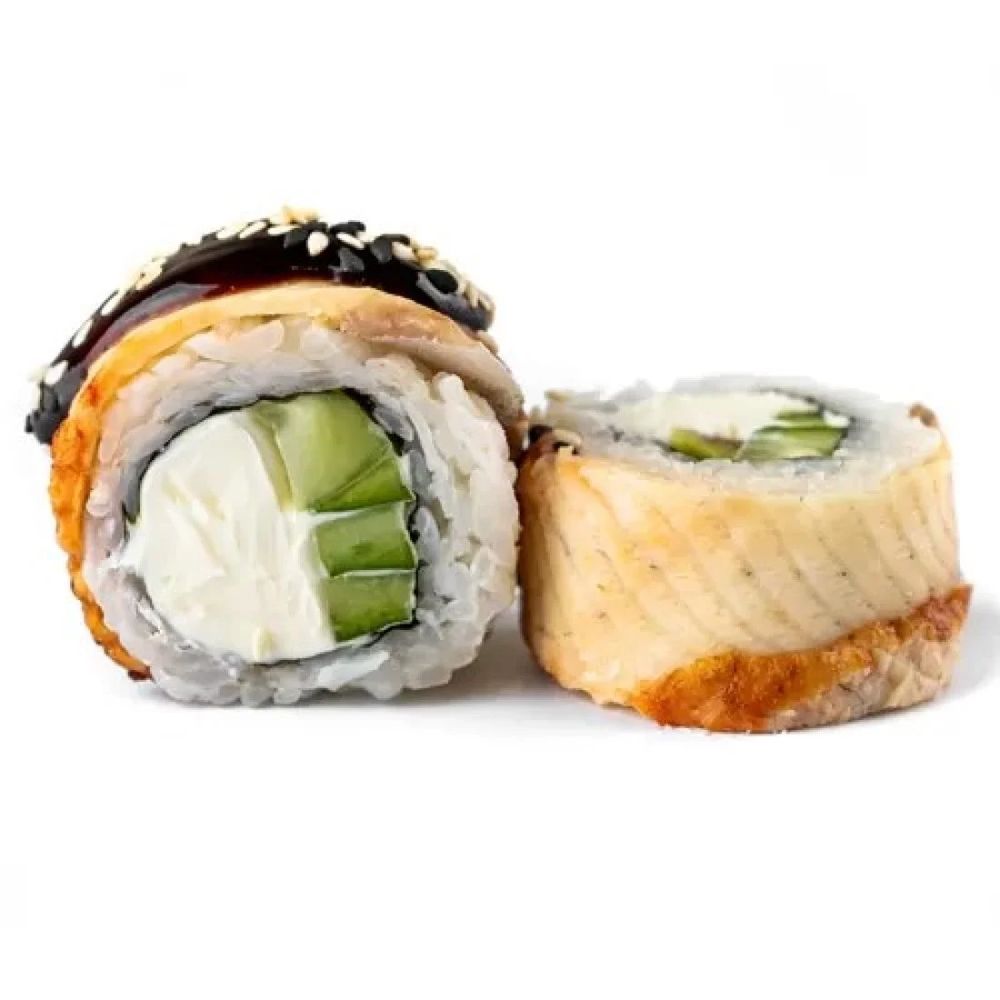 Рис, нори, сливочный сыр, огурец, угорь жареный, соус унаги, кунжут.