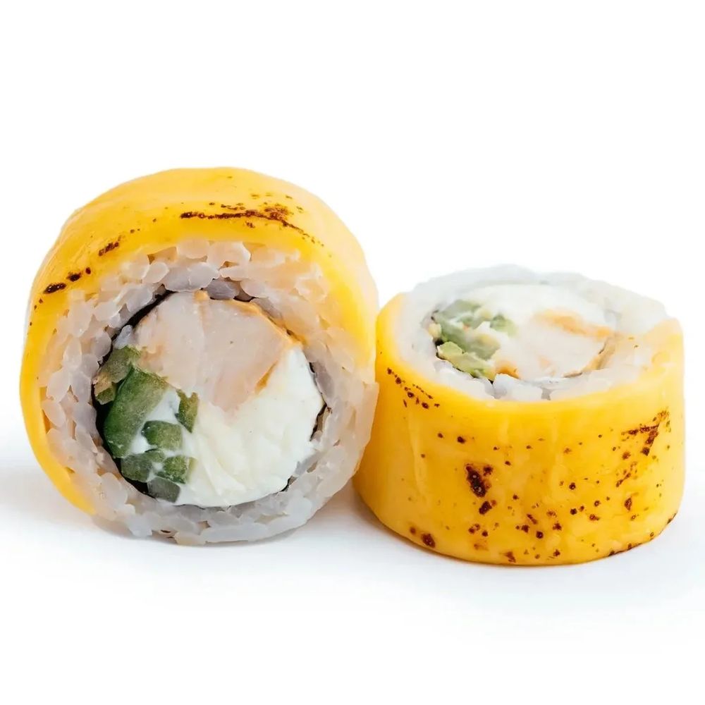 Рис, нори, сливочный сыр, огурец, курица копченая, сыр Чеддер.
