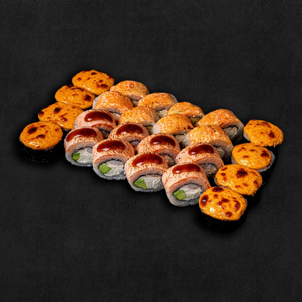 Ролл «Запеченный Чили Краб» : рис, нори, сливочный сыр, томат, снежный краб, острая сырная шапочка. Опаленный ролл «Америка» : рис, нори, сливочный сыр, копченый лосось, авокадо, сырная шапочка. Опаленный ролл «Сяке Маки» : рис, нори, креветка, лосось, авокадо, сливочный сыр, соус Унаги. *соусы и гарниры не входят в комплект, необходимо заказывать отдельно.