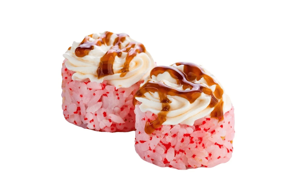 Рис, нори, снежный краб (имитация), сливочный сыр, огурец, икра Тобико, соус Унаги