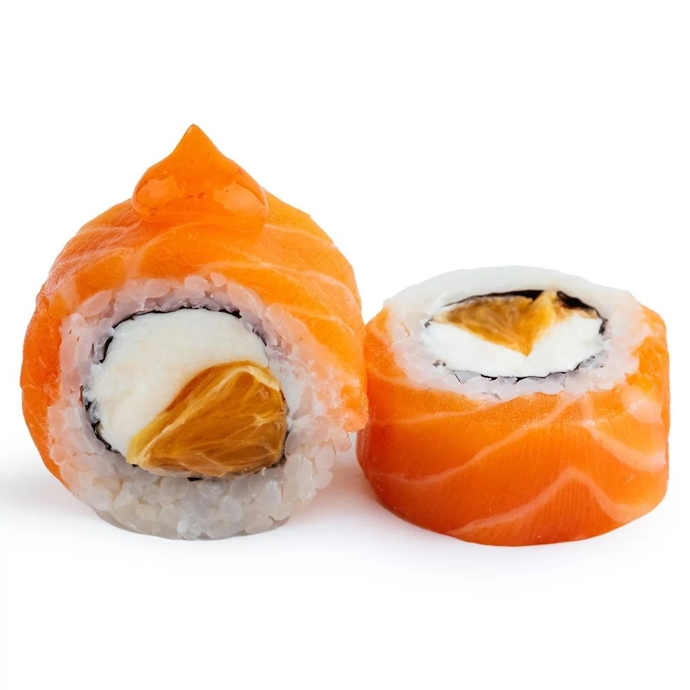 Рис, нори, лосось, сыр сливочный, мандарин, соус манго