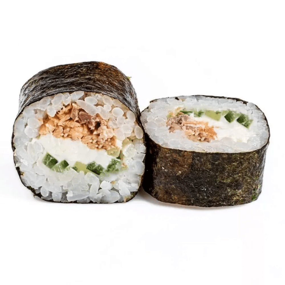 Рис, нори, сливочный сыр, лосось терияки, огурец.