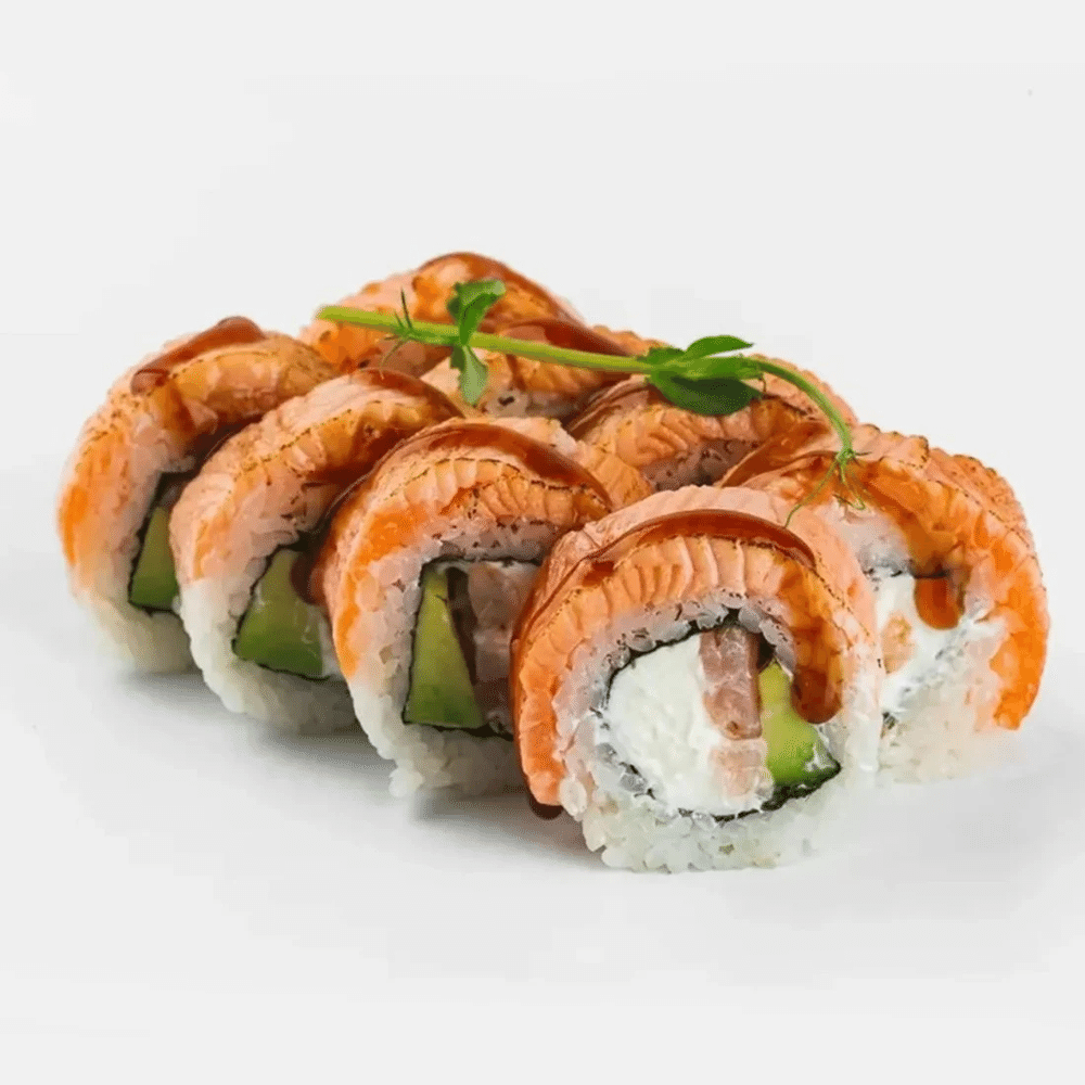 Рис, нори, креветка, лосось, авокадо, сливочный сыр, соус Унаги