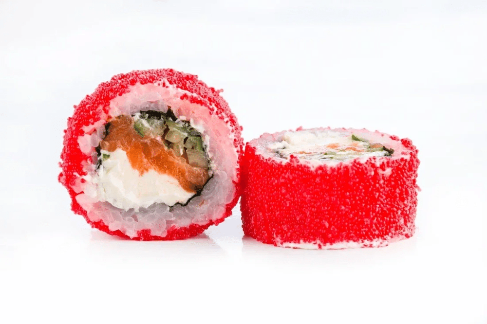 Рис, нори, лосось, сыр сливочный, огурец, икра Тобико