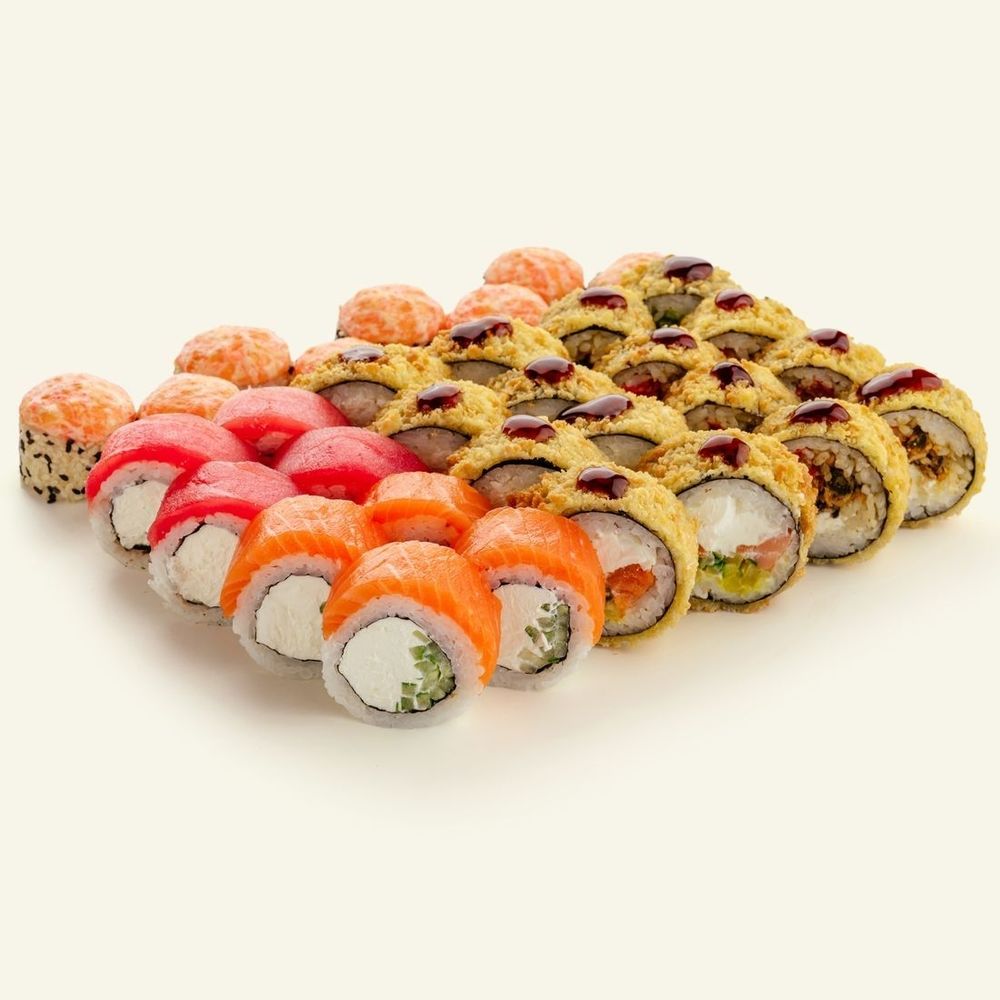 Ролл «Темпура Гурмэ с такуаном» : рис, нори, темпурная смесь, копченый лосось, такуан, сливочный сыр, огурец, соус Унаги.