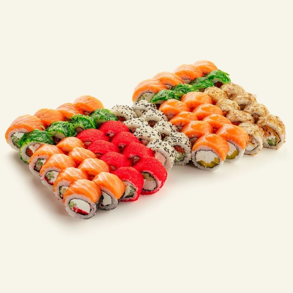 Ролл «Аляска»: рис, нори, сливочный сыр, лосось, угорь, огурец, Масага красная.