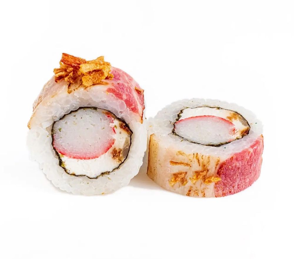 Рис, нори, сливочный сыр, снежный краб (имитация), лук кранч, бекон опаленный, соус сладкий чили. 270/135 гр