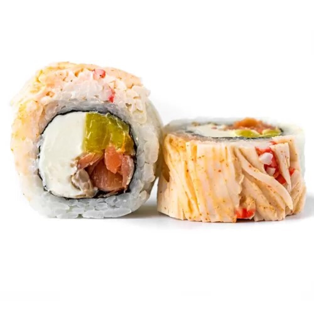 Рис, нори, сливочный сыр, лосось терияки, такуан, сурими, соус Спайси. 265/130 гр
