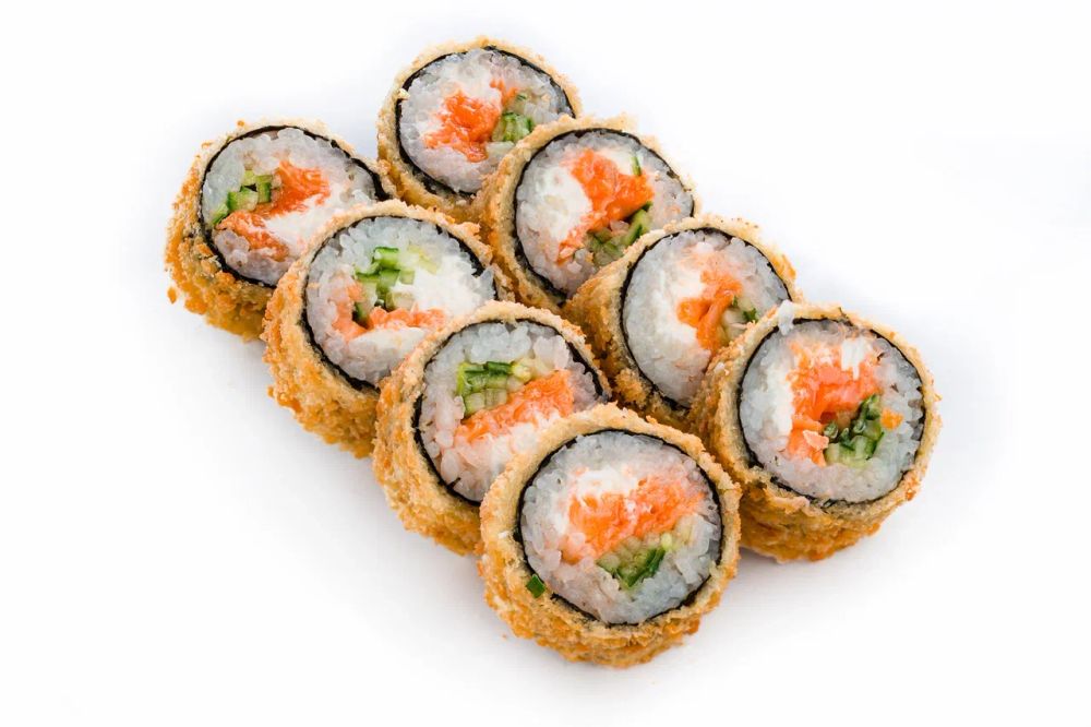 Рис, нори, темпурная смесь, лосось, огурец, сливочный сыр, огурец, соус Унаги.