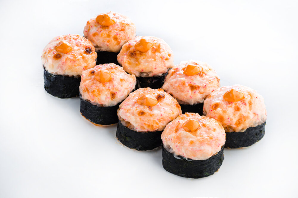 Рис, нори, лосось, сливочный сыр, огурец, соус Спайси, сырная шапочка.
