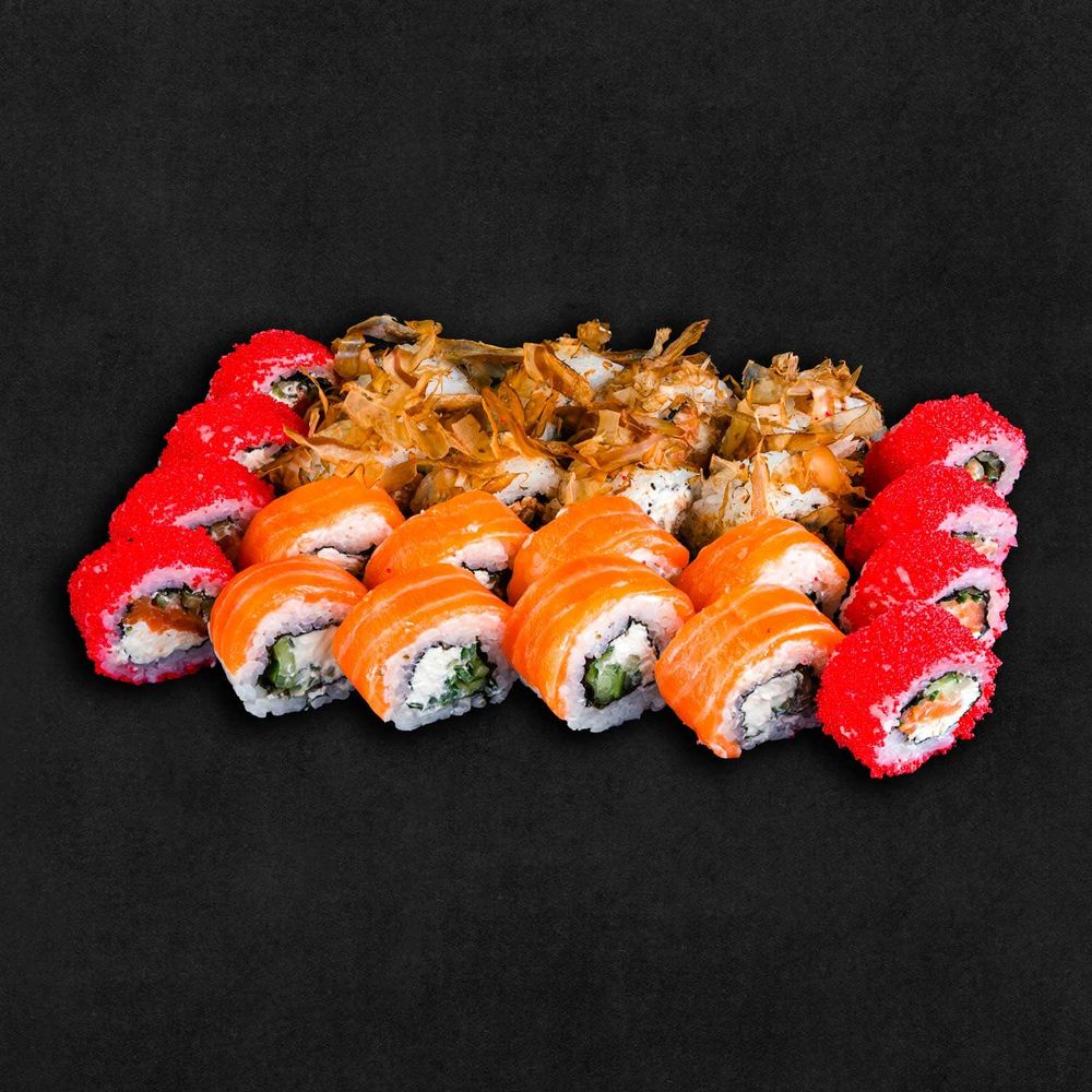 Ролл «Калифорния с лососем» : рис, нори, лосось, сыр сливочный, огурец, икра Тобико.