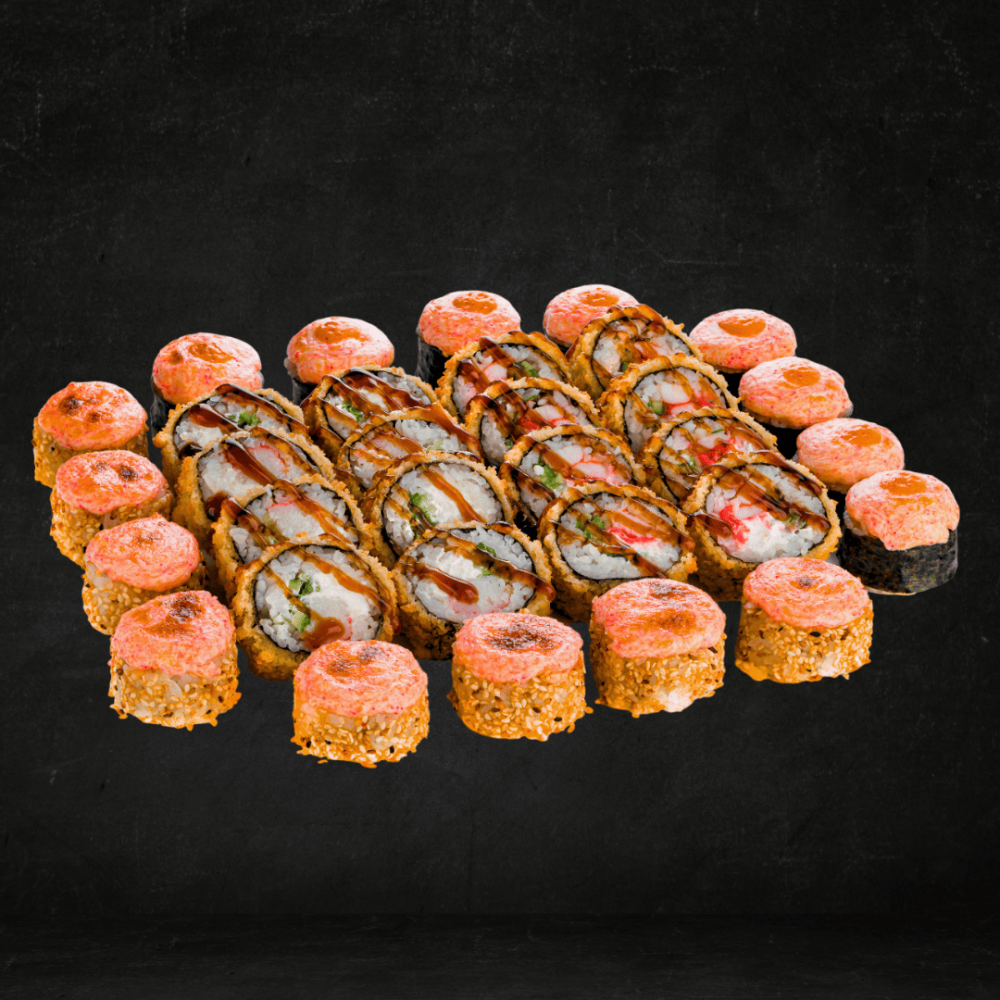 Ролл «Запеченный Дагон» : рис, нори, кунжут Кимчи, сливочный сыр, мидии, такуан, сырная шапка. Ролл «Запеченный с острым лососем» : рис, нори, лосось, сливочный сыр, огурец, соус Спайси, сырная шапочка. (острый). Ролл «Темпура Креветка» : рис, нори, темпурная смесь, креветка, сливочный сыр, огурец, имбирь, соус Унаги. Ролл «Темпура Краб» : рис, нори, темпурная смесь, сливочный сыр, сурими, огурец, соус Унаги. *соусы и гарниры не входят в комплект, необходимо заказывать отдельно.