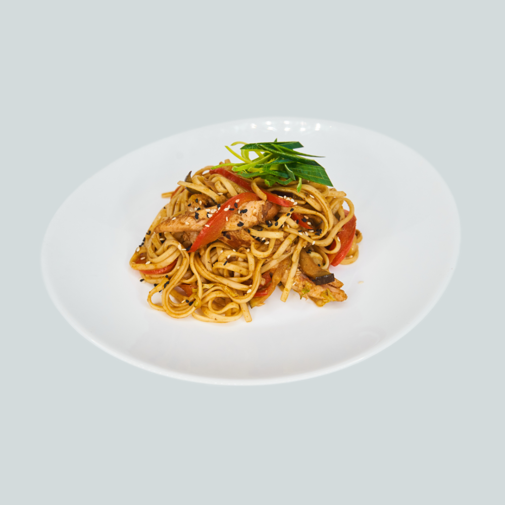 Лапша удон, филе курицы, овощной микс, соус Унаги, лук зеленый, кунжут.