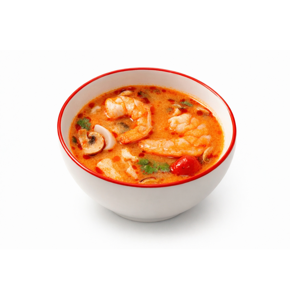 Бульон, кальмар, креветка, грибы шиитаке, кокосовое молоко, лук зеленый, паста Том Ям.