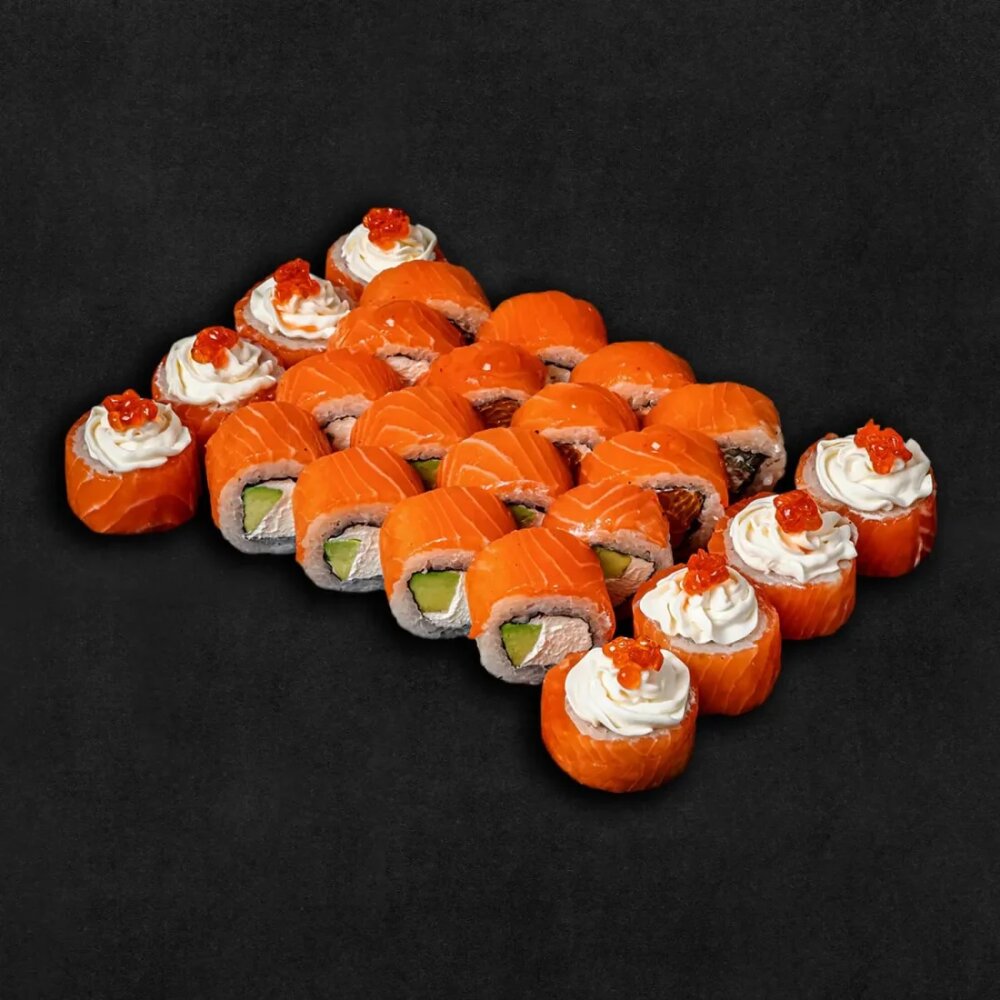 Ролл «Филадельфия Deluxe»: рис, нори, сливочный сыр, лосось, лососевая икра.