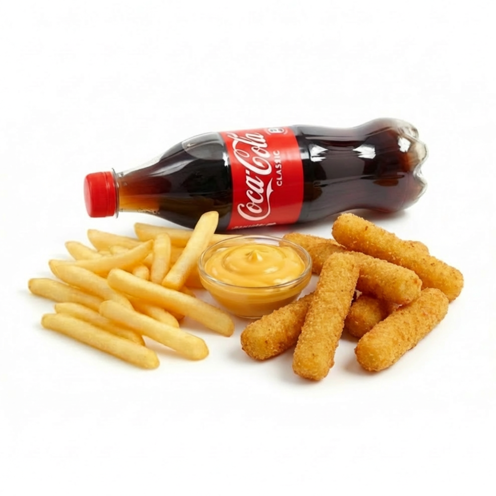 Картофель Фри 130 гр+сырные палочки 6 шт+соус сырный 40 гр,+Coca-Cola 0,5 л