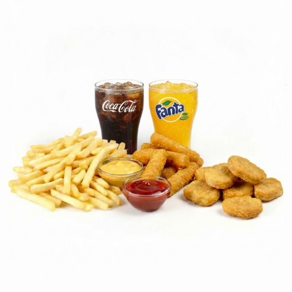 Картофель фри 2*130гр+наггетсы 10шт+сырные палочки 6 шт+кетчуп 40гр+соус сырный 40гр+ Fanta 0,5 л+Coca-Cola 0,5 л