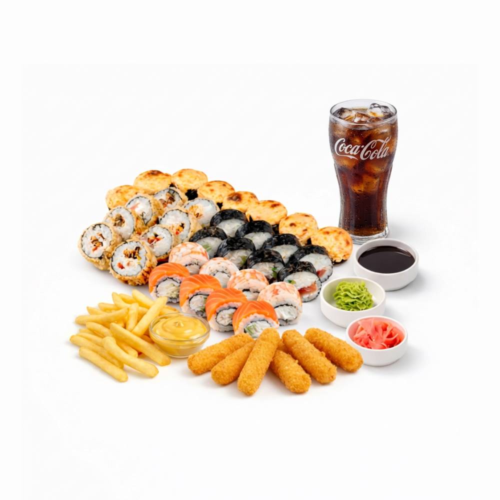 Картофель фри 130гр+сырные палочки 6 шт+ сырный соус 40 гр+Coca-Cola 0,5 л+ сет "Эгоистка"+гарнир сан