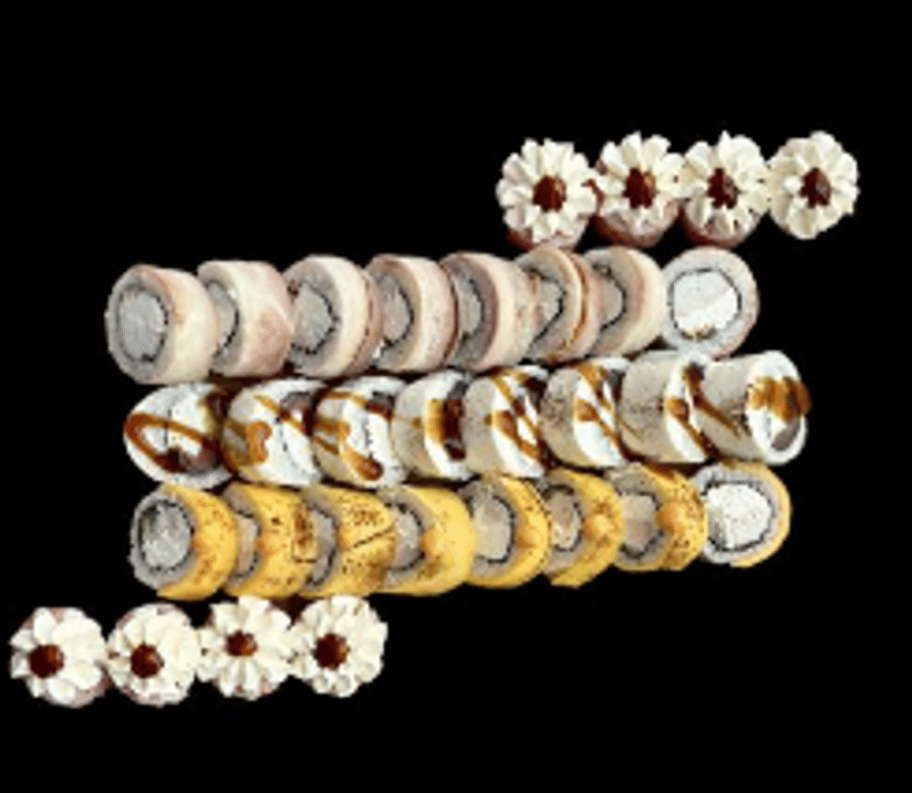 Ролл «Чеддер»: рис, нори, сливочный сыр, огурец, курица копченая, сыр чеддер, спайси соус.