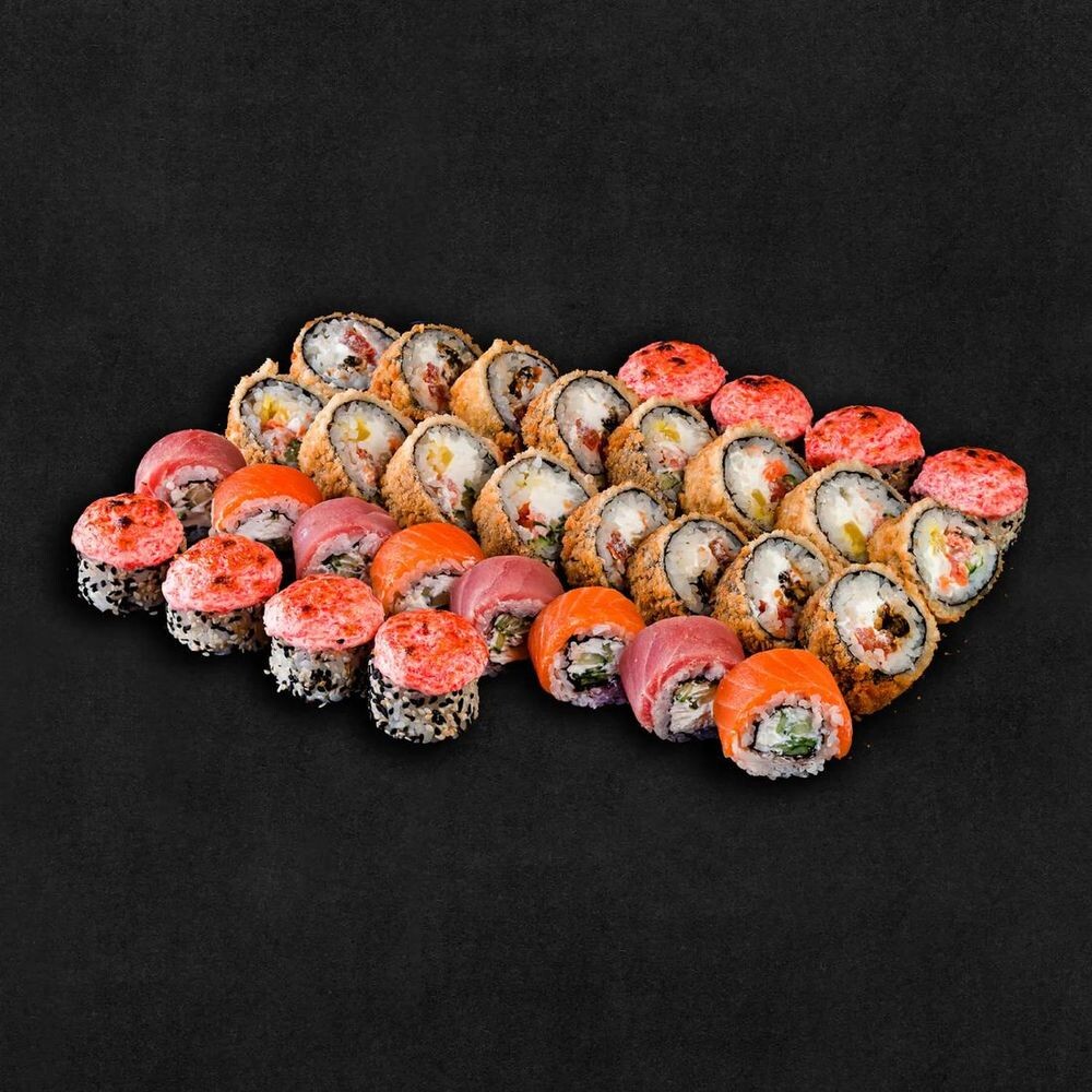 Ролл «Темпура Гурмэ с такуаном» : рис, нори, темпурная смесь, копченый лосось, такуан, сливочный сыр, огурец, соус Унаги.