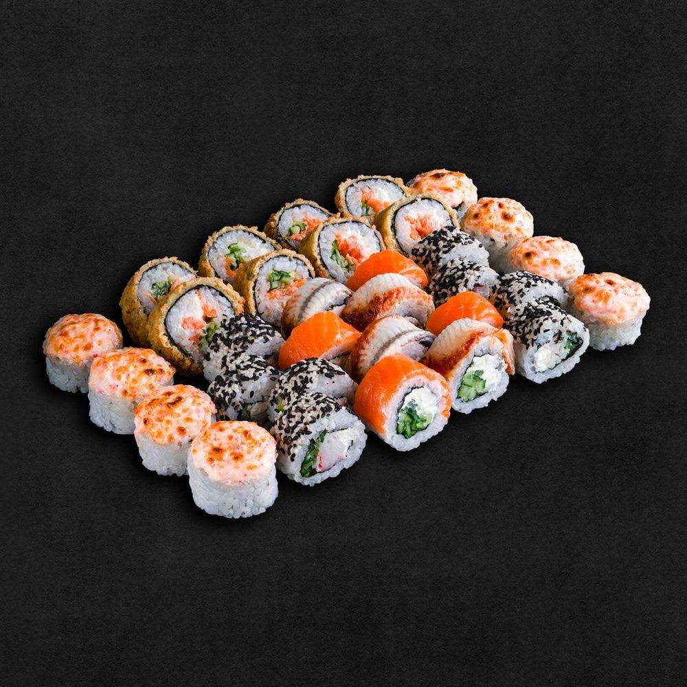 Ролл «Запеченная креветка» : рис, нори, креветка, сливочный сыр, пекинская капуста, огурец, сырная шапочка.