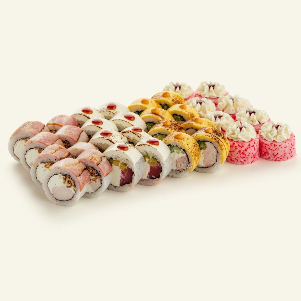 Ролл «Чеддер»: рис, нори, сливочный сыр, огурец, курица копченая, сыр чеддер, спайси соус.