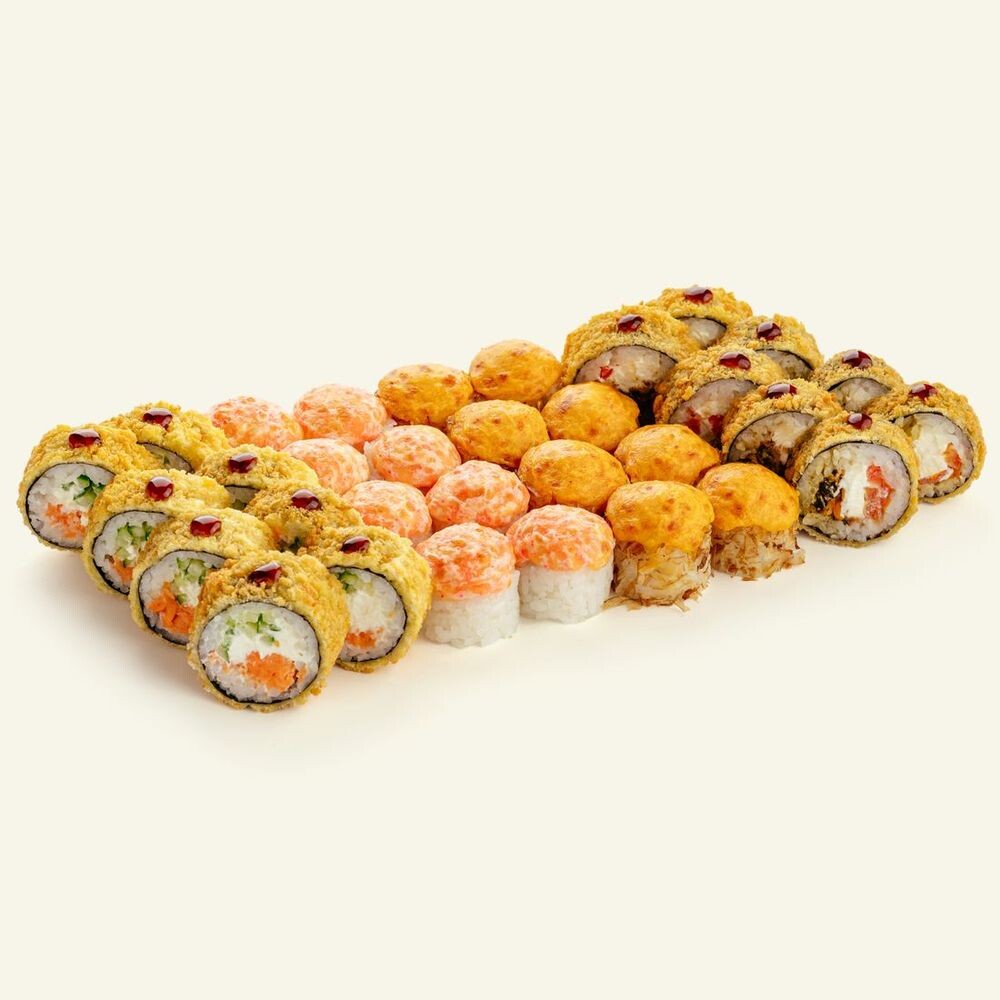 Ролл «Запеченная креветка» : рис, нори, креветка, сливочный сыр, пекинская капуста, огурец, сырная шапочка.