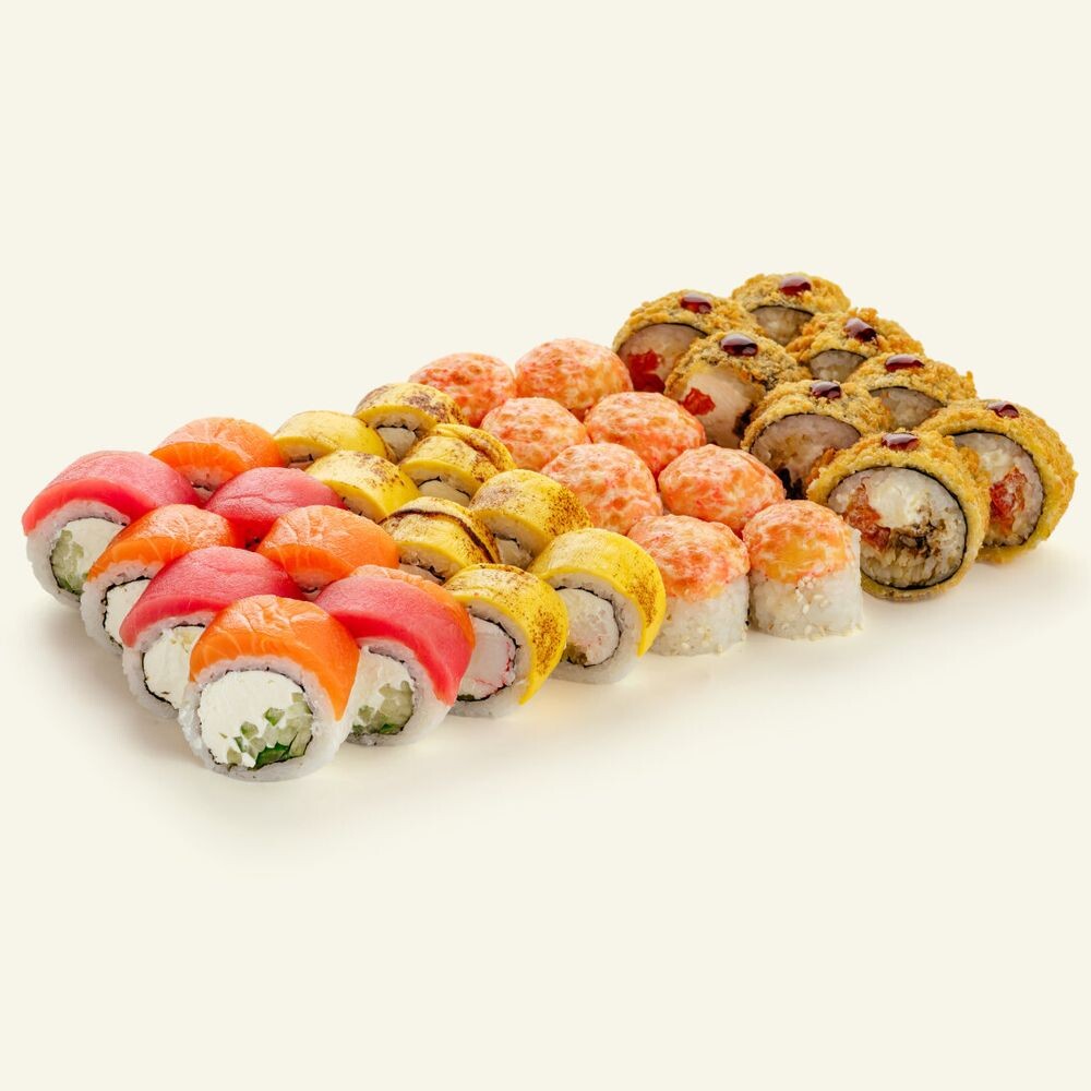 Ролл «Филадельфия Тунец» 0,5 : рис, нори, сливочный сыр, тунец, икра Тобико.
