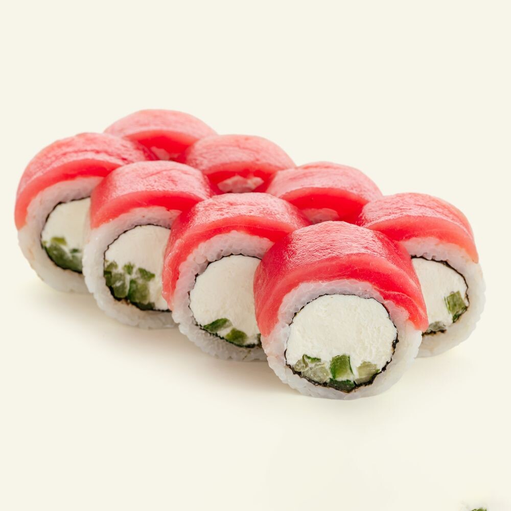 Рис, нори, сливочный сыр, огурец, тунец. Пищевая ценность на 100 граммах продукта: 176 ккал Белки: 8.9 Жиры: 7.1 Углеводы: 19