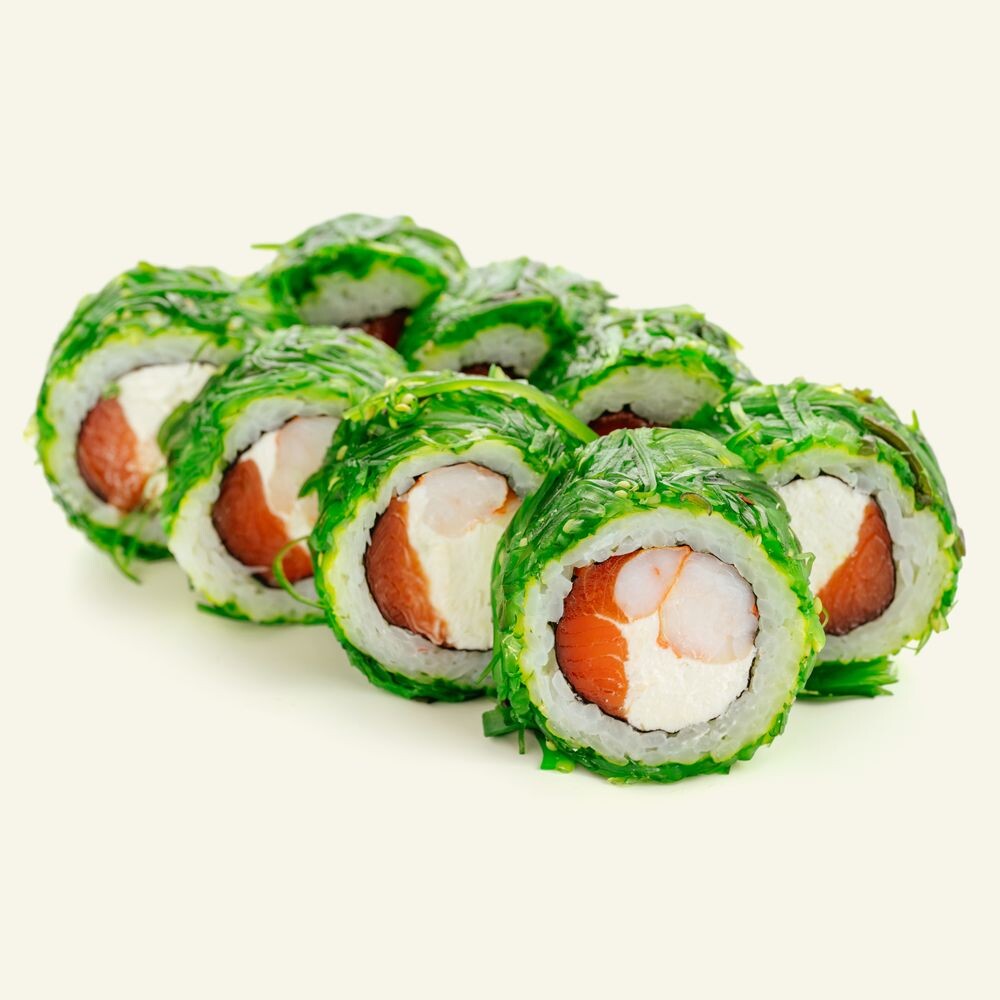 Рис, нори, сливочный сыр, лосось, креветка, салат чука, кунжут. Пищевая ценность на 100 граммах продукта: 209.8 ккал Белки: 8.4 Жиры: 9.3 Углеводы: 23