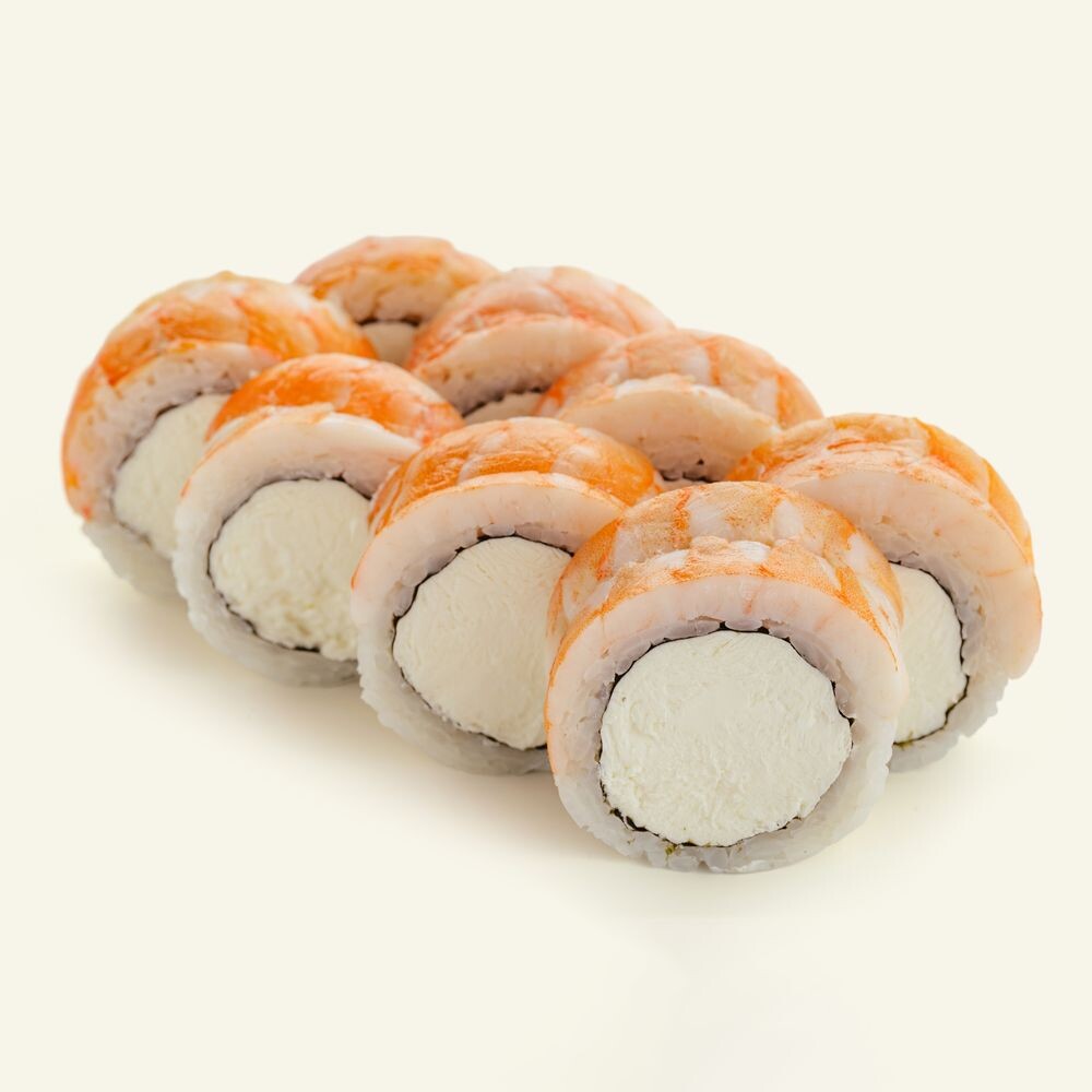 Рис, нори, сливочный сыр, креветка. Пищевая ценность на 100 граммах продукта: 176.2 ккал Белки: 7.8 Жиры: 7.1 Углеводы: 20.1