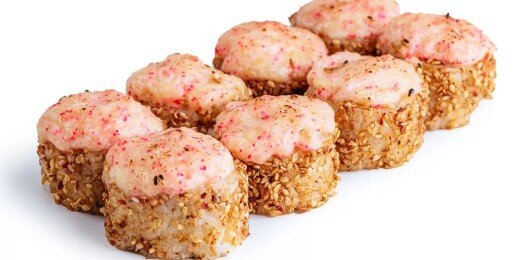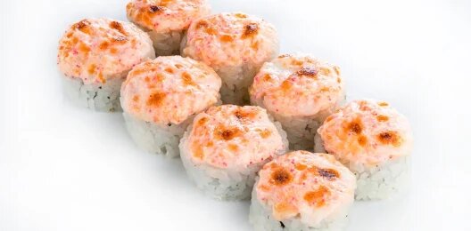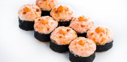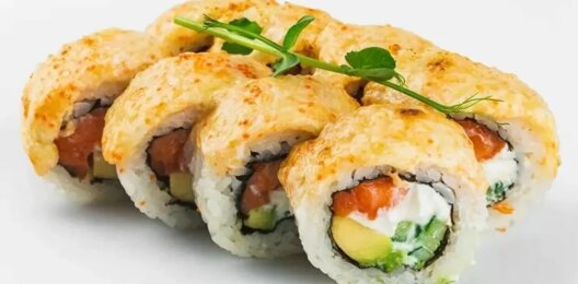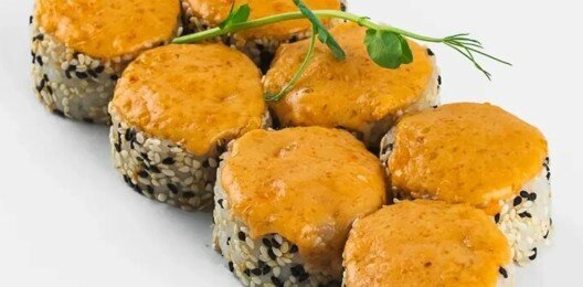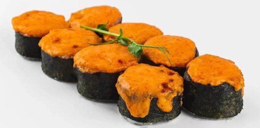 Рис, нори, лосось, банан, сливочный сыр, соус Манго Чили.
